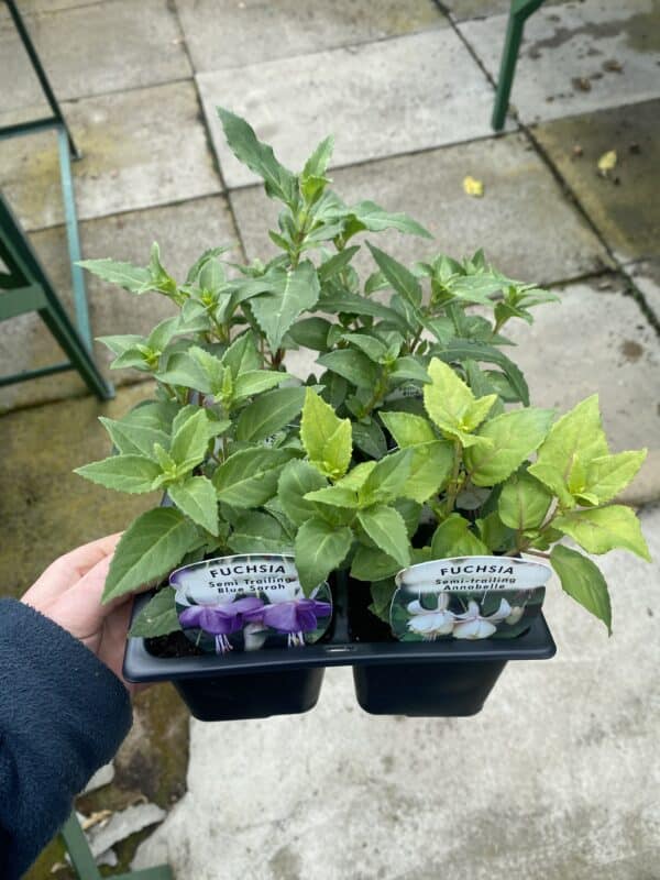 Varieties included in the packs but not limited to are: Semi-Trailing Annabelle, Trailing la Campanella, Trailing Swingtime, Semi-Trailing Miranka, Trailing Blue Mirage, Fuchsia Seventh Heaven, Hardybush Snowcap, Upright Patio Princess.