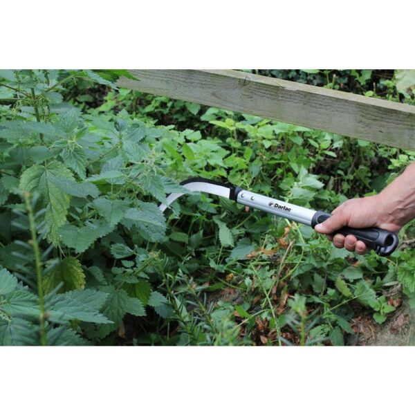 An aluminium handle with a solid rubber grip and a razor-sharp carbon steel blade which is resharpenable. Cut with a slicing rather than hacking action pulling back on the handle at the end of a swing. For clearing nettles, thistles, briars, undergrowth and vegetation. USE EXTREME CARE when working with sharp objects. AN AWARD WINNER
