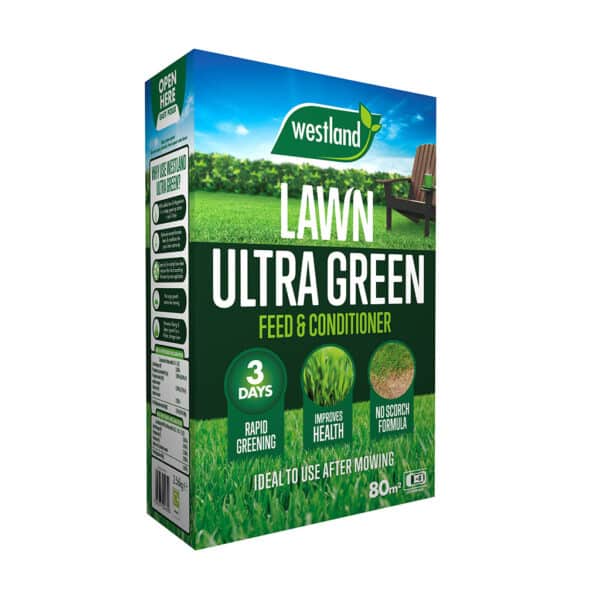 Westland Ultra Green is a feed and conditioner which is ideal to use after mowing. It has added iron and magnesium for rapid deep greening action. It’s balanced nutrient formula feeds and conditions the grass from root-to-tip. It has been specially formulated to reduce risk of scorching the lawn by over application.